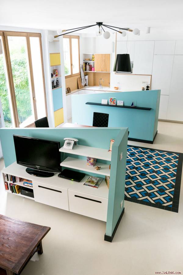 Nửa bên phải của nhà bếp sử dụng màu trắng để tăng cường ánh sáng vào căn hộ. Vách ngăn nửa giúp bạn không bị hạn chế tầm nhìn.